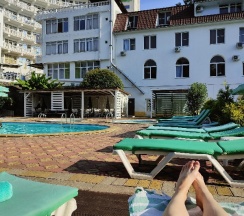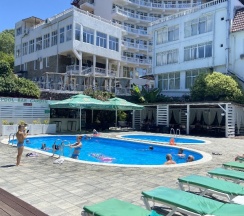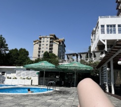 Плюсы: 2 бассейна с подогревом, лежаки, небольшая детская площадка, спортивная площадка, игротека с TV-приставками, детская комната, беседки, анимация для детей и взрослых, кофейный автомат, бар, трансфер до пляжа, теннис , бильярд, бытовая комната, читальный зал. Номера просторные, звукоизоляция хорошая: удобные кровати, КПБ и полотенца белые без пятен, не застиранные. Техника вся работает: чайник, холодильник, кондиционер, телевизор, Wi-fi, сантехника, фен. Средства гигиены приносят, мусор выносят ежедневно. На этаже места для сушки белья, гладильные принадлежности. В здании кулер, комната матери и ребёнка.