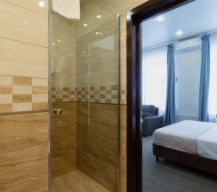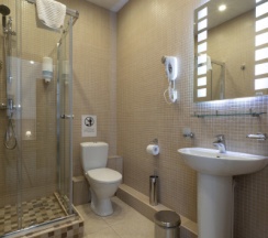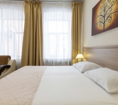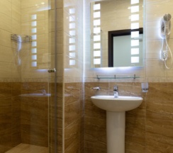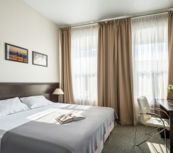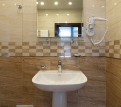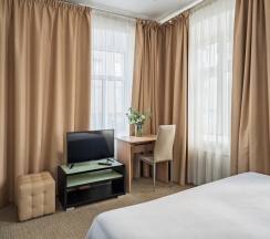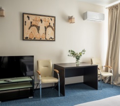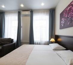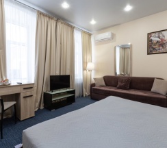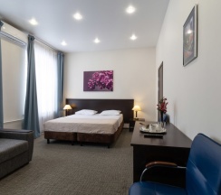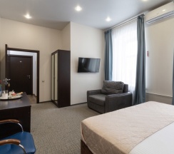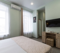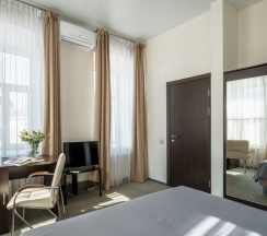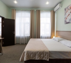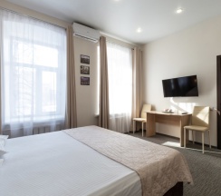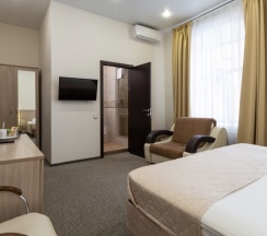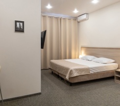 Комфортабельные номера категории "Полулюкс" позволяют разместить до 2 гостей и имеют площадь около 22 кв.м. Ванная комната такого номера оборудована современной сантехникой и душевой кабиной. В ванной имеются все необходимые туалетные принадлежности, фен и тапочки. Набор мебели включает одну или две кровати, шкаф, стол, стул. Мебель и сантехника приобретены в 2018 году. Номер оборудован кондиционером, звукоизоляция улучшена, это, наряду с продуманным дизайном интерьера, делают проживание в номере комфортным. В номере установлен плоско-панельный телевизор с широким выбором телевизионных каналов, работает бесплатный высокоскоростной Wi-Fi. Курение в отеле строго воспрещается!