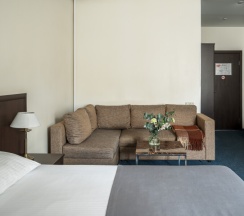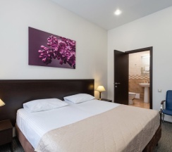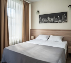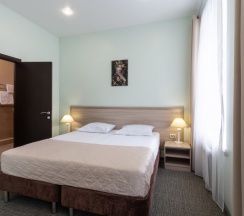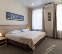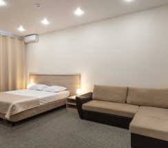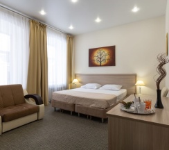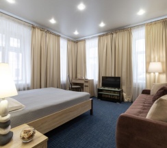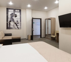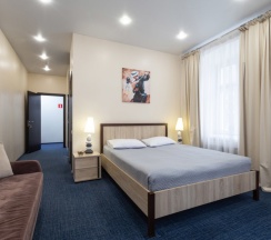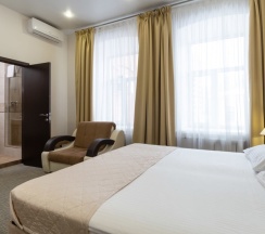 Большие двухместные номера c возможностью размещения до 4 гостей имеют площадь около 25 кв.м. Ванная комната такого номера оборудована современной сантехникой и душевой кабиной. В ванной имеются все необходимые туалетные принадлежности, тапочки и фен. Набор мебели включает одну двуспальную кровать размера king size, диван-кровать, шкаф, стол, стул. Мебель и сантехника приобретены в 2018 году. Номера оборудованы кондиционерами, звукоизоляция улучшена, что, наряду с продуманным дизайном интерьера, делают проживание в этих номерах комфортным. Бесплатный высокоскоростной Wi-Fi обеспечивает нашим гостям доступ в интернет, а плоско-панельный телевизор позволяют просматривать большое количество телевизионных каналов. Курение в отеле строго воспрещается!