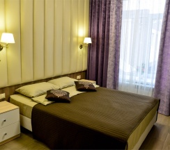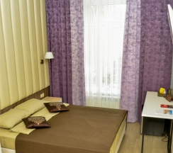 Оригинальный дизайн, большие окна с красивыми портьерами и удобная кровать с изголовьем придают номеру романтические нотки. Раздельный санузел с душем, большой телевизор, двойная дверь и зеркальный шкаф добавляют номеру изысканный шарм.