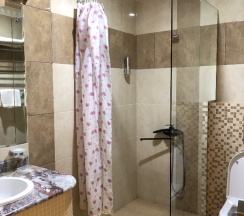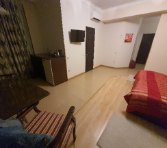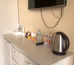 -Рабочий кондиционер, телевизор, холодильник, чайник, кружки и пакетики с чаем, столовые приборы, каждый день приносят бутылку воды и делают сухую уборку, есть зубной набор, два вида полотенец и одно для ног, сейф. Ванная комната очень комфортная, красивая, чистая - для меня это очень важно. Фото на сайте совпадают на 100% с реальностью. Также меня приятно удивили завтраки, которые видимо были включены в стоимость, хотя я этого совсем не ожидала. Причём выбор очень хороший, а-ля шведский стол, где ты сам всё себе накладываешь. Есть кофемашина. Даже для меня, как для вегетарианки, нашлось, что покушать и быть сытой аж до обеда. В самом гостевом доме спокойно и тихо, что тоже немаловажно.