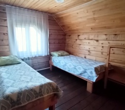 Дом построен из кедрового бруса, разделен на 2 половины, каждая вместимостью до 6 человек. В половине есть санузел с душевой кабиной, кухня - гостиная укомплектованная всем для приготовления пищи.