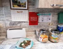 С 7 до 11 утра на ПРОСТОРНЕЙШЕЙ и чистой кухне выставляют два вида каши, а в холодильнике ждёт молоко + всегда можно взять бесплатный чай (чёрный и зелёный). Всё это бесплатно. И так каждое утро.Холодильников, кстати, тоже два,как и микроволновок. Есть плита,чайник,то есть все самое необходимое.Чистая не только кухня, но и уже упомянутые выше туалеты и душевые.