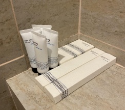 Также был набор воды в номере, шампунь, бальзам и гель для душа, одноразовые щетки.