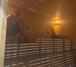 В-третьих, сауна большая, но для такого помещения слишком маленькая температура и там просто тепло, а хотелось, чтобы было жарко, для чего мы туда и идем, единственное, что очень сильно обжигает ноги пол и полок.