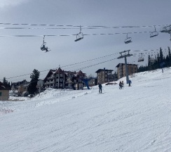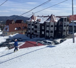 На территории есть свой прокат, далеко ходить и тащить лыжи не надо, надел и сразу поехал, дом находится удобно, что сразу к подъёмнику и кассе спускаешься на лыжах.