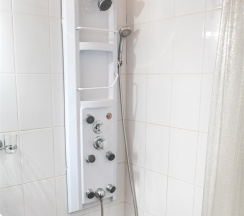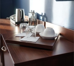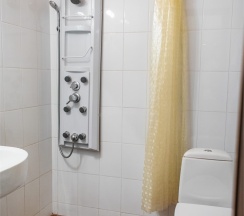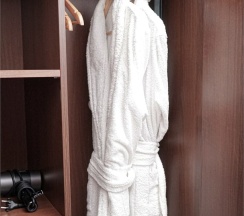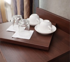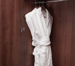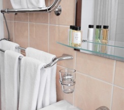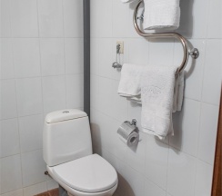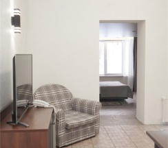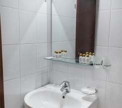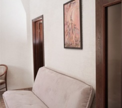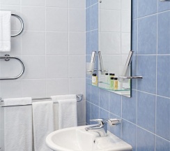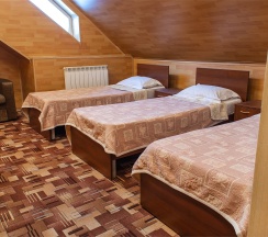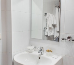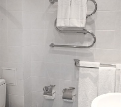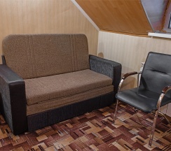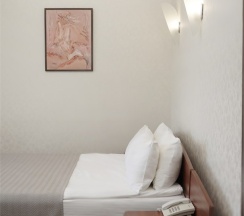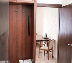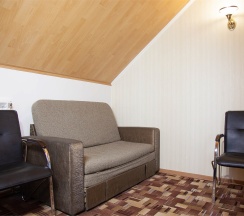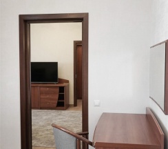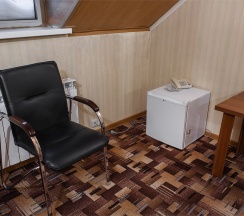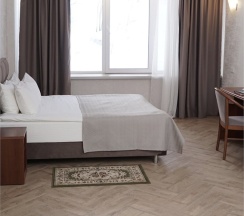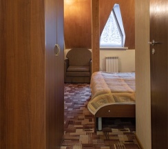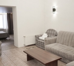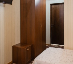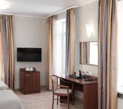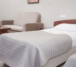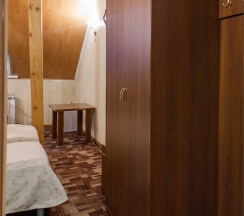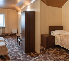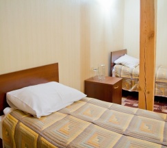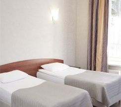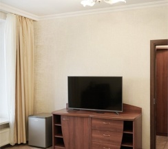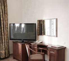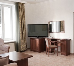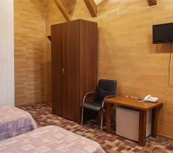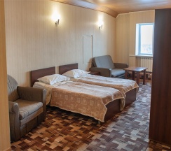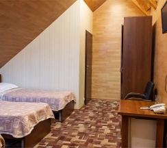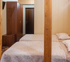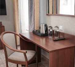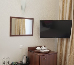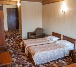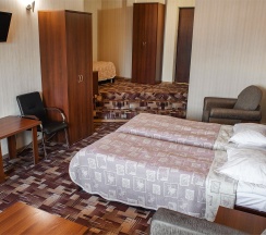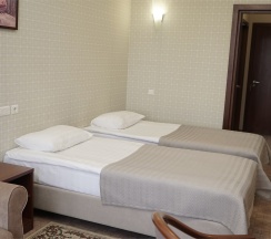 В номере: две 1,5 спальные кровати размером 90х200 см (по Вашему запросу мы можем объединить кровати), кресло-кровать, шкаф для одежды, письменный стол, журнальный столик, чайник, чайный набор, TV, холодильник, сейф, телефон, фен, санузел с душем (комплект из трех полотенец для каждого гостя и набор средств для гигиены).