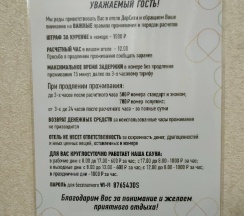Гостиница понравилась. Переночевали семьей с двумя детьми. Чисто, тихо, всё необходимое есть. С утра нас покормили завтраком. Кофе из кофемашины и чай на ресепшн в любое время суток бесплатно. Спасибо за вашу работу!