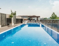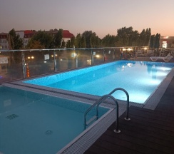На крыше бассейн, вода в нём чистая, кристальная, тёплая. Также, вся крыша - это уютная терраса с баром, столиками, шезлонгами, диванами, креслами и детской площадкой. В баре готовят вкусные коктейли, лимонад и не только.