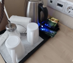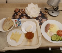 В номере есть свой чайник, небольшой холодильник, сейф, шкаф с плечиками, стол с несколькими розетками рядом, кондиционер, телевизор. Есть мелочи типа кружек, чая и тп. В туалете зеркало, электрическая сушилка для одежды, фен, унитаз - все рабочее. Душ не очень: засорен, но помыться хватает, по устройству поддон со шторкой, так что вода на полу. Вентиляция в туалете средняя, нужно бы делать вытяжку. В номере есть wi-fi, выдало 50 мбит, поработать хватило вполне. Мусор выносят каждый день, постельное белье раз в 3 дня меняют, также и тапочки и полотенца (полотенец дали много). Это мини-гостиница, номеров немного, все на первом этаже, окна во двор, но все равно слышно утром прохожих и приходится зашториваться. Гостиница на территории обычного дома с забором, для входа нужен чип, для первого посещения нужно звонить в охрану. Чип на 2хместный номер выдали один. Завтраки сытные, сделаны по-домашнему, остатки уносили в номер: на выбор яичница с овощами и сосиской, тоже но омлет, каши и блинчики. Также дают сок, сыр, хлеб и тп. На кухне есть микроволновка, но греет плоховато. Есть общий утюг, вполне себе нормальный. Администратор ведет себя просто и по-домашнему, не мешает заниматься делами.