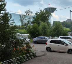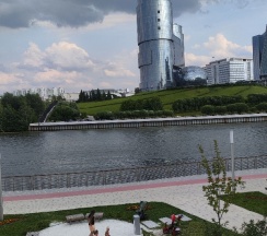 Сам отель в жилом дома. Вокруг зелено, выходишь практически на набережную. За рекой Крокус, Вегас, метро. Идти недалеко. Все вокруг чистое, новое.