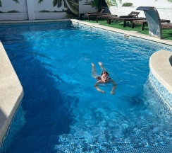 Есть свой бассейн, бар, можно заказать наивкуснейшую пиццу, шашлык, рыбу,овощи на мангале.