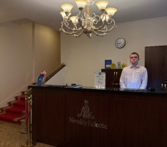 Отель находится на 4 этаже жилого дома. Когда зашли в подъезд-немного испугались и подумали, что перепутали. Подъезд не похож на парадную и сейчас находится на стадии ремонта. Ресепшен малюсенький и выглядит скудно), но номер очень хороший с белоснежным постельным бельем, все чисто, матрац удобный, в ванной теплые полы.