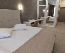 Просторный номер, площадью 30 кв.м. Номер со светлым, классическим дизайном. Номер оснащен всем необходимым для комфортного пребывания: кровать (2000x1900 см), телевизор, телефон, фен, электрический чайник, мини холодильник, кондиционер, чайный набор, гигиенические средства (гель для душа, шампунь, мыло), тапочки, халат.