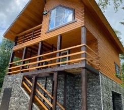 Очень уютно и спокойно! Ночью горят гирлянды, как в сказке. Есть мангал, банный чан. Очень чисто, постель свежая, приятная. Душ идеально вымыт. На кухне всё обустроено, можно свои продукты.