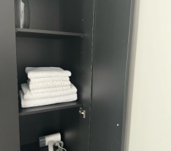 Постельное белье на общей кровати, 2 одеяла, 4 подушки (зачем столько), фен, компактный отпариватель (вроде бы), обогреватель переносной, кондиционер, несколько батарей-радиаторов. Мини-холодильник. В ванной горячий радиатор-сушилка для одежды. Полотенца 2 комплекта. Халатов не было. Посуда на 2 персоны. Микроволновка. Чайник. Стол, 2 стула. Шкаф с плечиками и мини-сейфом. Рожок для обуви. На окнах есть шторы, в туалете на окне — плотная непросвечивающая. Несколько розеток.