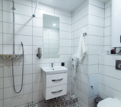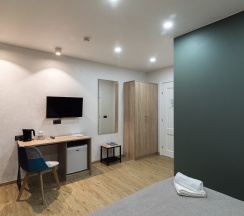 Хорошие, вежливые администраторы.Номер удобный, чистый.В кухне все есть, полный комфорт. Туалет, душ чистые удобные.Единственный минус летом ,очень холодные полы.