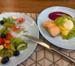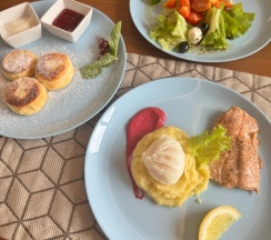 Пятёрка за дизайн, и здание снаружи красивое, и внутри довольно необычно выглядит. Завтрак нужно выбирать заранее, без шведского стола, но всё вкусненько, есть из чего выбрать.