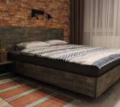 Широкая двуспальная кровать (180см); прикроватные тумбочки; столик; вешалка для одежды ;подставка для обуви; телевизор; на полу ламинат; собственная ванная комната (душевая кабина, пол с подогревом)