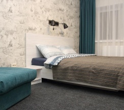 Широкая двуспальная кровать (180см); прикроватные тумбочки; столик; гардероб; вешалка для одежды ; подставка для обуви; телевизор; на полу ковролин или ламинат; собственная ванная комната (душевая кабина, пол с подогревом)