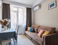 Понравилось: Уютная студия. Всё очень продумано. Есть всё, включая хороший утюг, фен и даже стиралка. Удобная кровать. Небольшая кухня, но всё новое и приличное. Спасибо!