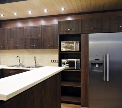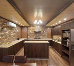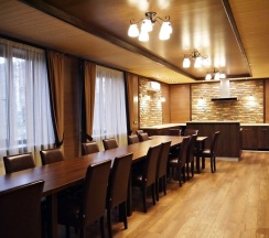 - банкетный зал с большим столом, кухонной и обеденной зоной оборудованной всей бытовой техникой (холодильник, плита, 2 эл чайника, 2 капсульные кофе машины, микроволновая печь) и посудой (столовые и кухонные приборы (банкетные тарелки, бокалы, фужеры и т.д.)).