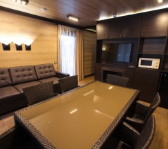 115 кв.м, рассчитан на 10 чел., макс. размещение до 16 чел. (спальных мест на 6 чел.) Комплектация: Две двухместные кровати ( с ортопедическим матрасом и подушками в отдельных комнатах); Один двухместный раскладной диван в гостиной.