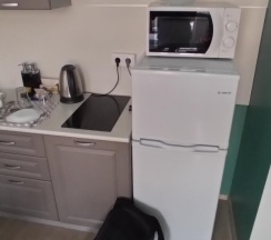 Микроволновка, чайник, холодильник, плита ,посуда ,чтобы готовить. Пользовалась утюгом, который находится в отдельной комнате.Тихий дворик .