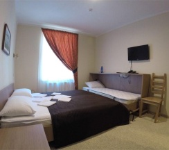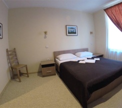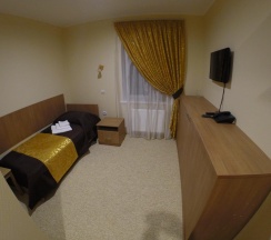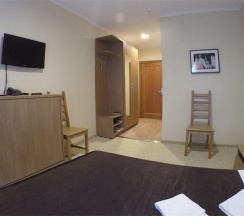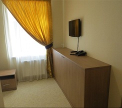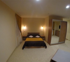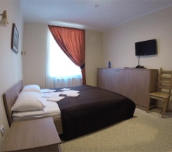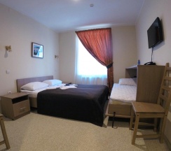 Комната, рассчитанная на проживание двух человек, оборудована одной широкой (160 см.) кроватью, возможно одноместное размещение, шкафом для одежды, Двумя прикроватными тумбочками, телевизором, холодильником. На полу – мягкий ковролин, в прихожей зоне – напольная плитка. В номере есть телефон и бесплатный доступ к сети Интернет (Wi-Fi). По запросу предоставляется комплект посуды, фен и утюг. В каждом номере отдельная туалетная комната с душем. При необходимости проживания в номере третьего человека, стол-тумба трансформируется в отдельное дополнительное спальное место. Номер идеально подходит для семейного размещения.