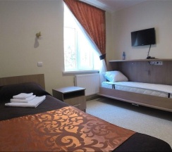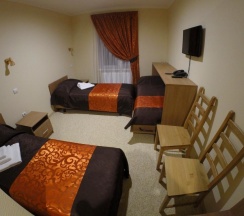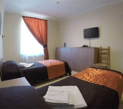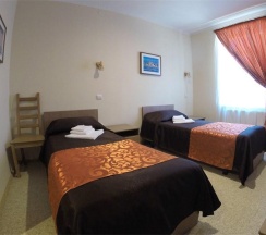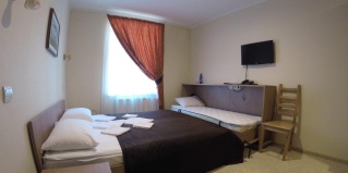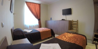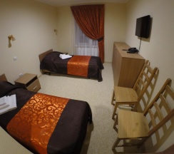 Комната, рассчитанная на проживание двух человек, оборудована двумя односпальными кроватями, шкафом для одежды, Двумя прикроватными тумбочками, телевизором, холодильником. На полу – мягкий ковролин, в прихожей зоне – напольная плитка. В номере есть телефон и бесплатный доступ к сети Интернет (Wi-Fi). По запросу предоставляется комплект посуды, фен и утюг. В каждом номере отдельная туалетная комната с душем. При необходимости проживания в номере третьего человека, стол-тумба трансформируется в отдельное дополнительное спальное место.