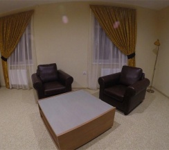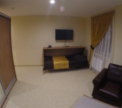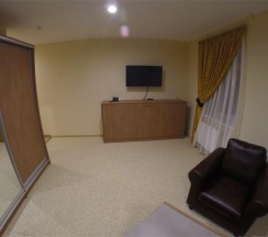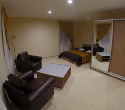 Большой просторный номер с двуспальной кроватью привлечет внимание семейный пар или родителей с ребенком. Размещение на дополнительном месте возможно при необходимости. Современный интерьер, удобная кожаная мягкая мебель, журнальный столик, большой шкаф-купе с зеркалом в пол, большой телевизор, холодильник. Телефон, беспроводной интернет – вот все, что может понадобиться для комфортного проживания в нашем гостеприимном отеле. Напольное покрытие – мягкий ковролин и напольная плитка в прихожей зоне. Имеется отдельная туалетная комната с душем. При индивидуальном запросе предоставляется комплект посуды, фен и утюг.