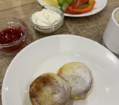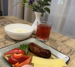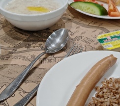 - отличный завтрак, очень плотный, сытный. В дополнении к выбранным блюдам каждый день есть овощи (помидоры/огурцы/перец болгарский), нарезка колбасы 2-3 вида, сыр (1-2 вида), мед, варенье, сметана, изюм, курага, чернослив, грецкий орех. Облепиховый морс и кофе черный из кофемашины, в который можно добавить молоко (есть чайничек с ним).
