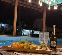Прекрасная локация, продуманный до мелочей дом, отличная банька, уютные комнаты в своеобразном стиле. Сад и бассейн, окружённые горами. Уединенная локация с огромной территорией, в 5 минутах от подъемников и всей инфраструктуры. С детьми можно отлично отдыхать - купаться, играть в футбол и настольные игры в беседке с гамаками. Отдохнули прекрасно, хочется вернуться!