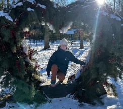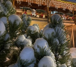 На улице возле домика есть мангальная зона, где папа на ужин пожарил шашлычок, а мы с сестренкой рядом лепили снежки.