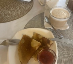 завтрак стандартный(яичница, кофе, блины и гречневая каша с молоком, бутерброд с маслом и сыром)