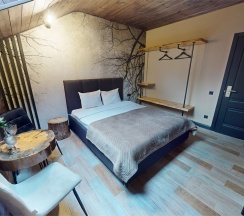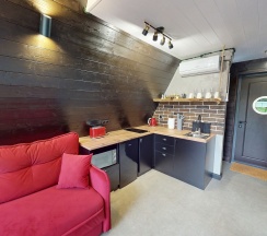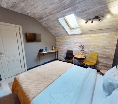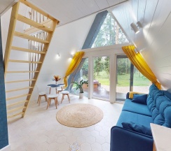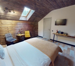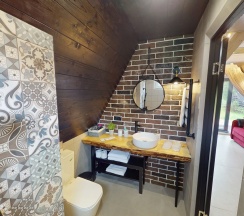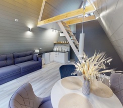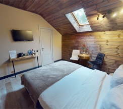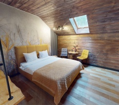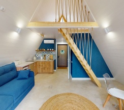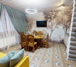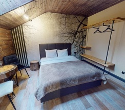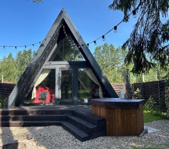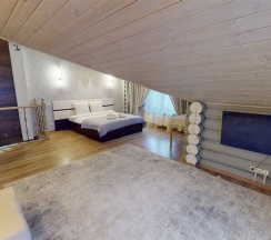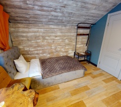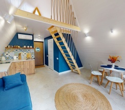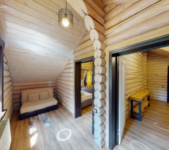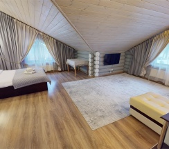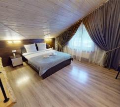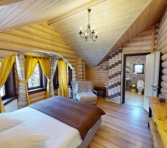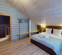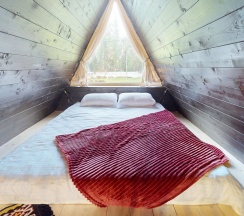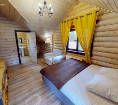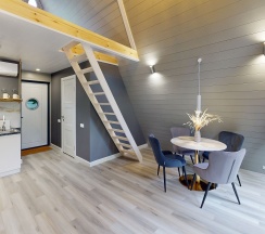 Комфортабельный коттедж идеально подойдет как для молодоженов, так и для компании друзей. В коттедже Люкс роскошная спальня на втором этаже, на первом этаже гостиная с мини-кухней, санузел и просторная терраса. Размещение 2 человека, возможно 4 дополнительных места. На кухне холодильник, микроволновая печь, чайник, посуда, столовые приборы. Постельное белье входит в стоимость проживания. Бесплатный Wi-Fi, Smart TV, теплые полы для дополнительного комфорта.