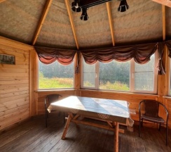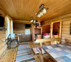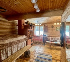 Большой комфортный дом с четырьмя уютными спальнями, с просторной и вместительной гостиной, совмещенной оборудованной кухонной зоной. В доме имеется туалетная комната с душевой кабинкой. Вход в дом сопровождается стильной крытой террасой с открывающимся видом на пороги реки «Летняя» Подходит для полного уединения с природой, поскольку находится на опушке соснового бора с отдельным заездом.