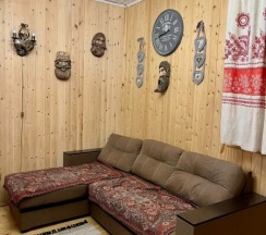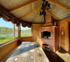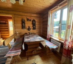 Деревенская изба с русской белой печью, имеются современная кухня, туалет и ванная. В кухне есть вся необходимая посуда. На уютной веранде приятно вечером посидеть и полюбоваться на красивый закат. У дома небольшое поле, на котором можно поиграть в футбол, волейбол, бадминтон.