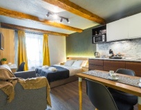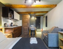 Снимал номер-студию с двуспальной кроватью. Номер довольно просторный. Есть практически все, помимо бытовой техники, которую можно посмотреть на фотках, также есть средства гигиены в душевой и чай, кофе, сахар на кухне. В номере очень уютно. Из минуса - плесневеющая стиралка, но если стирать не планируете, то вам будет пофиг.