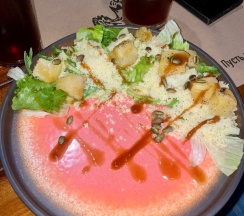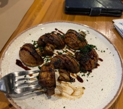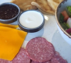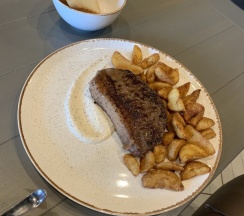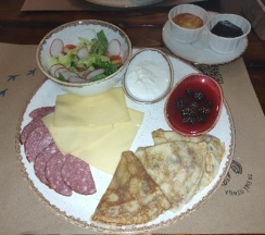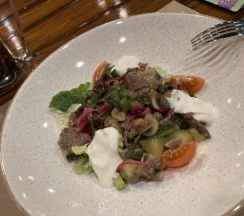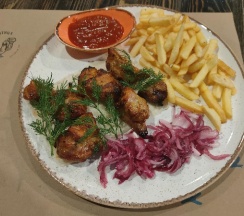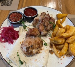 Ужин - в пакет входит шашлык или салат, плюс по 2 бокала пива. Взяли свиной и куриный шашлыки, куриный хороший, а свиной невкусный (само мясо плохое, с жилами). Докупили ещё шампиньоны, вкусные. Пиво понравилось, выбрали светлое. Позже в номер ещё заказывали лимонад и молочный коктейль - были вкусными. Наверное, надо дать кухне ещё шанс и попробовать рульку и крылышки - коллеги хвалили.