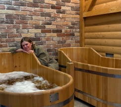От сауны и пивной бочки в восторге🔥 Сауна жаркая, как надо! Пивная бочка супер, вкусный пивной аромат на всю сауну. Травяная тоже понравилась, но пивная интереснее😁 2 часа нам было очень мало, пожалели, что сразу больше не забронировали. Жаль, что при бронировании не рассказали про купель, тоже бы заказали, узнали о ней позже. В сауне есть простыни, полотенца, халаты, тапочки, косметика.