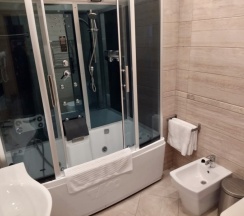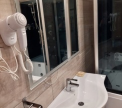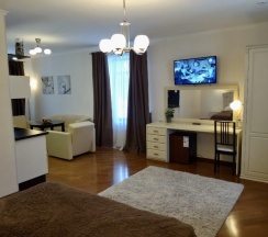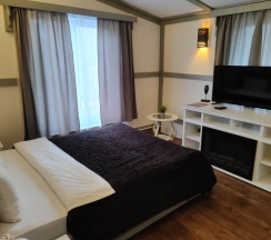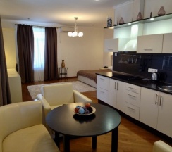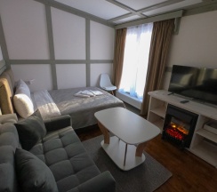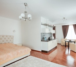 Красивый просторный номер с большой удобной кроватью. В номере есть обеденная зона с мягкими креслами, полноценная кухня, большая душевая кабина.