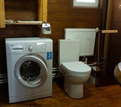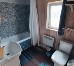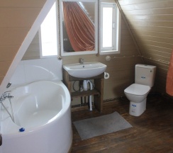 В санузле на первом этаже - ванна, умывальник, унитаз, фен, зубной набор, полотенца.