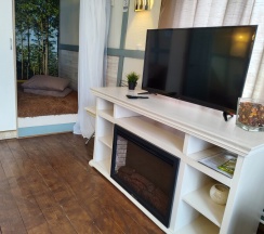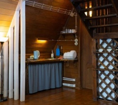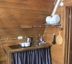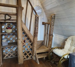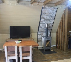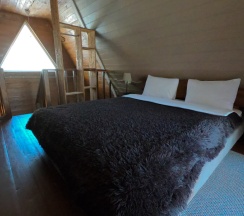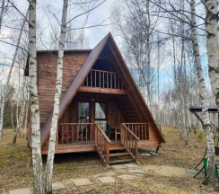 Двухэтажный дом-афрейм подойдет для семейного отдыха. На первом этаже - двуспальная кровать, мини-кухня, санузел, обеденная зона, телевизор, шкафы для одежды. На втором - две односпальные кровати. Дополнительное место может быть организовано на диване на первом этаже.