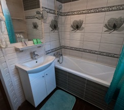 На кухне - индукционная плита, холодильник с морозилкой, раковина, микроволновка, набор посуды, бокалов, приборы, посуда для приготовления еды, чайник, нож, разделочная доска, средство для мытья посуды. В ванной комнате установлена стиральная машинка, что дает возможность планировать длительное проживание.