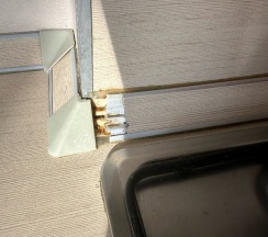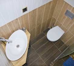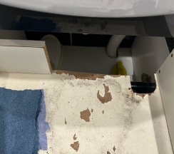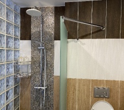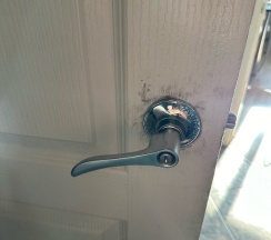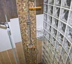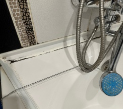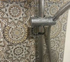 2. Душ не работает в ванной, держалка лейки на какой то самодельной приспособе, в самой душевой была видно раньше дверь теперь нету.. бежит вода на пол … от этого видно что вспухла дверь.