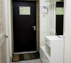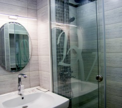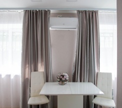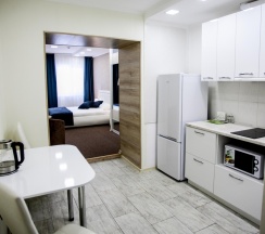 Площадь жилой комнаты 22 кв.м. Оборудование номера: полутора спальная кровать, обеденный стол, стул, шкаф, шкаф-купе, интерактивное ТВ, WI-FI, кухонный гарнитур, вытяжка, холодильник, варочная поверхность, микроволновая печь, кондиционер, чайник, посуда, утюг, гладильная доска. В ванной комнате: душ, стиральная машина, сушка для белья, халат, тапочки, полотенца и туалетные принадлежности.