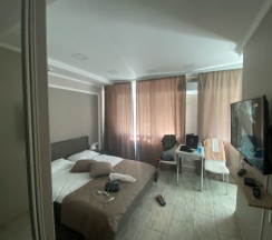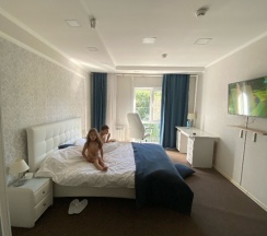 Номер просто огромный, с кондеем, большой кроватью, холодильник, плита, рабочее место, парковка для авто, удобно добираться, 6000 тыс сутки, это плюсы. Минус - в момент нахождения, терминал для оплаты по безналу не работал. Так что налик наше всё!
