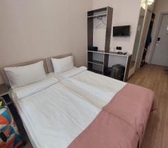 Хорошая гостиница, я останавливалась на сутки в двухместном номере, окна выходили на улицу, но ночью движения машин почти нет, соседей тоже не было слышно, я хорошо спала. В номере были чай, кофе, сахар, одноразовые тапочки, зубная щетка и паста. Везде чисто и уютно. До заселения и после выселения можно было оставить вещи, очень удобно. Расположение прекрасное, до метро идти минут семь. Рядом есть круглосуточный продуктовый