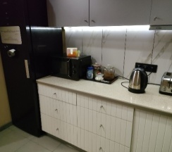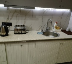 Есть кухня общая , с чайником , микроволновой, холодильником и посудой.